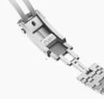 The skeleton hands and raised indexes are rhodium-plated and are filled with white Super-LumiNova, while the helium escape valve has been given a conical design.