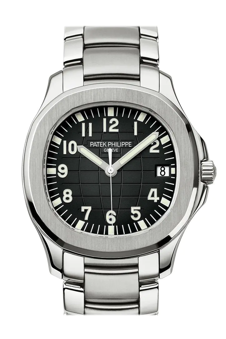 Silver-tone stainless steel case with a silver-tone stainless steel bracelet. Fixed silver-tone stainless steel bezel. Black dial with luminous hands and Arabic hour markers. Minute markers around the outer rim. Dial Type: Analog. Luminescent hands and markers. Date display at the 3 o’clock position. Patek Philippe Calibre 324 S C Automatic movement, containing 29 Jewels, composed of 213 parts, bitting at 28800 vph, and has a power reserve of approximately 45 hours. Scratch resistant sapphire crystal. Screw down crown. Transparent see through case back. Oval case shape, case size: 40 mm x 40 mm. Fold over with push button release clasp. Water resistant at 120 meters / 400 feet. Functions: date, hour, minute, second. Aquanaut Series. Luxury watch style. Patek Philippe Aquanaut Black Dial Stainless Steel Automatic Mens Watch 5167-1A Patek Philippe Stainless Steel Aquanaut Watch 5167/1A 5167-1A 5167