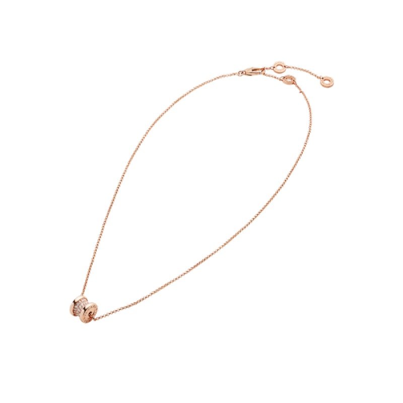 Inspired by the world-famous amphitheater, the Colosseum, the B.zero1 necklace is a true expression of Bvlgari’s creative vision, challenging the very essence of jewelry design. Its unique, pure spiral shape symbolizes the harmony of past, present and future – reflected in the splendor of the Eternal City – and the pioneering spirit of the collection. B.zero1 necklace in 18K rose gold with pavé diamonds.