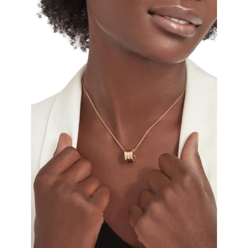 Inspired by the world-famous amphitheater, the Colosseum, the B.zero1 necklace is a true expression of Bvlgari’s creative vision, challenging the very essence of jewelry design. Its unique, pure spiral shape symbolizes the harmony of past, present and future – reflected in the splendor of the Eternal City – and the pioneering spirit of the collection. B.zero1 round pendant with necklace, small size, 18K rose gold. Diameter 0.60 inches (1.50 cm). Length 14.96-17.70 inches (38-45 cm).