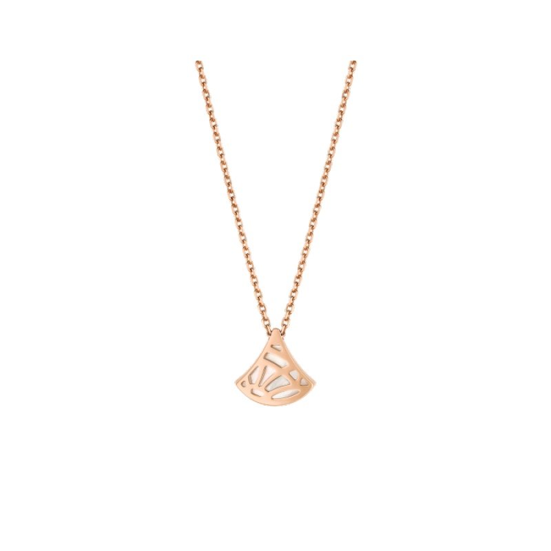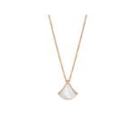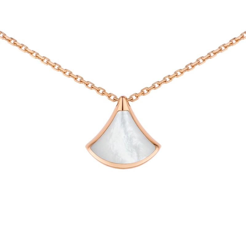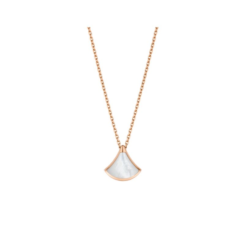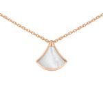 The Divas’ Dream necklace in 18K rose gold is a subtle expression of joyful femininity, with an elegant interpretation of the iconic fan motif. The collection is deeply rooted in Bvlgari’s Roman heritage, and its aesthetic is reflected in a delicate mini pendant inlaid with mother-of-pearl. This timeless and elegant piece celebrates the beauty of nature.