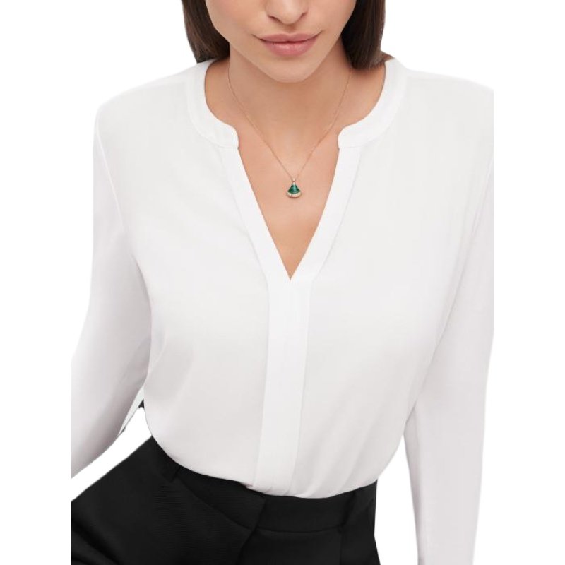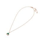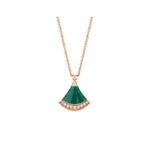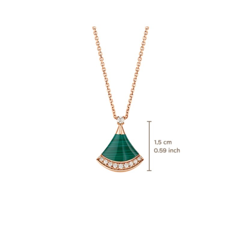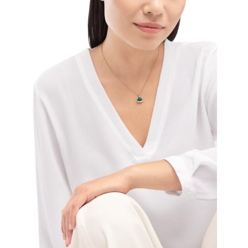 The Divas’ Dream necklace in 18K rose gold is a subtle expression of joyful femininity, with a colorful design that interprets the iconic fan pattern. The signature aesthetic of the collection is presented through a delicate pendant, which is cleverly set with a green malachite and embellished with pavé diamonds, reflecting Bvlgari’s Roman heritage. This piece is elegant and timeless, celebrating the beauty of nature.