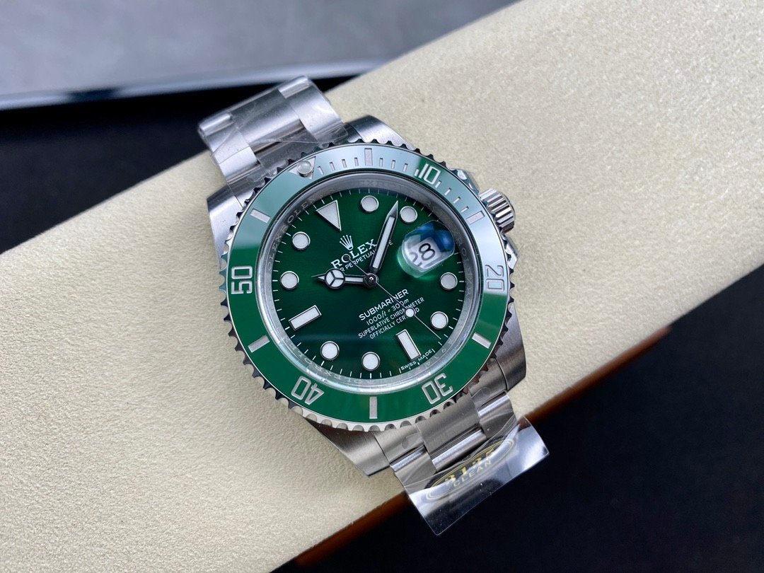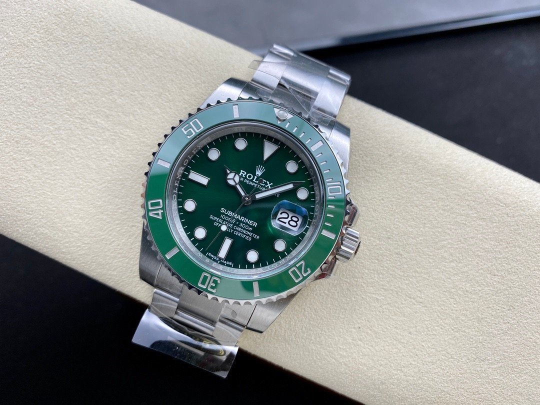 | DIAL | – Green HULK Sunburst Dial – Hour Markers and Hands coated with Bright Superluminova Blue Luminescence Phosphorescent Lume that glows up to 4 to 6 hours at night with uniform luminosity throughout – Exact 1:1 Correct Font Size and highly legible Chromalight display |