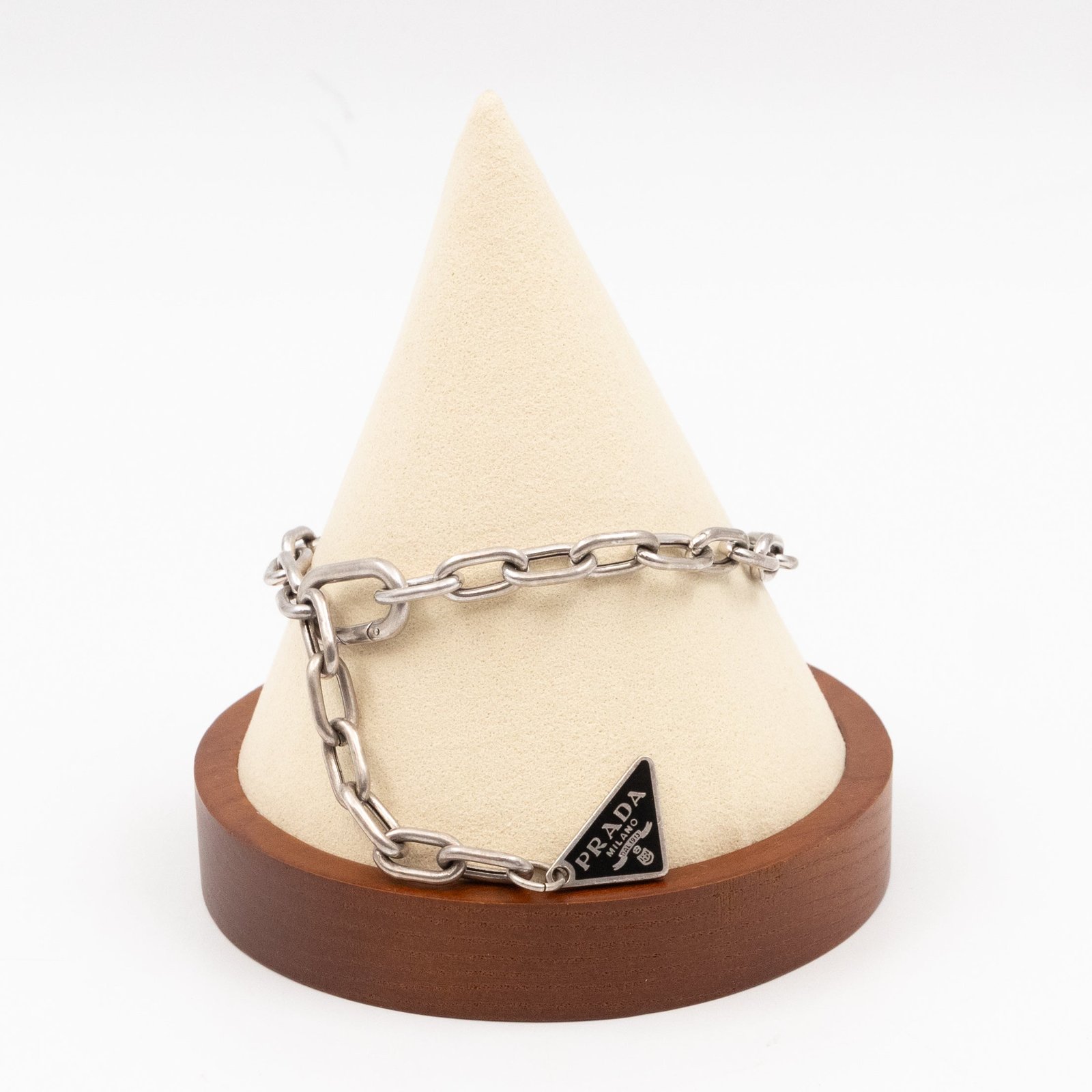 This is a very rare Prada triangle charm logo bracelet. Made in 925 silver and black enamel on the triangle. With a minimalist design, this bracelet adds a touch of luxury and sophistication to any outfit. Total wearable length is 24 cm. Retail price $850.